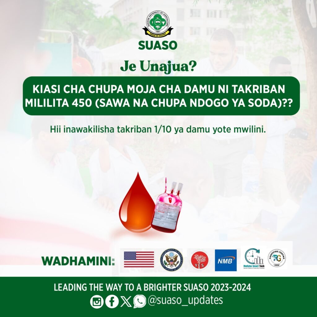 We are thrilled to announce an upcoming event that has the potential to make a profound difference in the lives of many: a Blood Donation Drive is scheduled on May 4th, 2024, and is organized with Sokoine University of Agriculture Students’ Organization (SUASO), and supported by Kennedy-Lugar Youth Exchange and Study, the United States Department of State, Mafisho Smart Tech (MST), NMB, and RG Shopping Center.